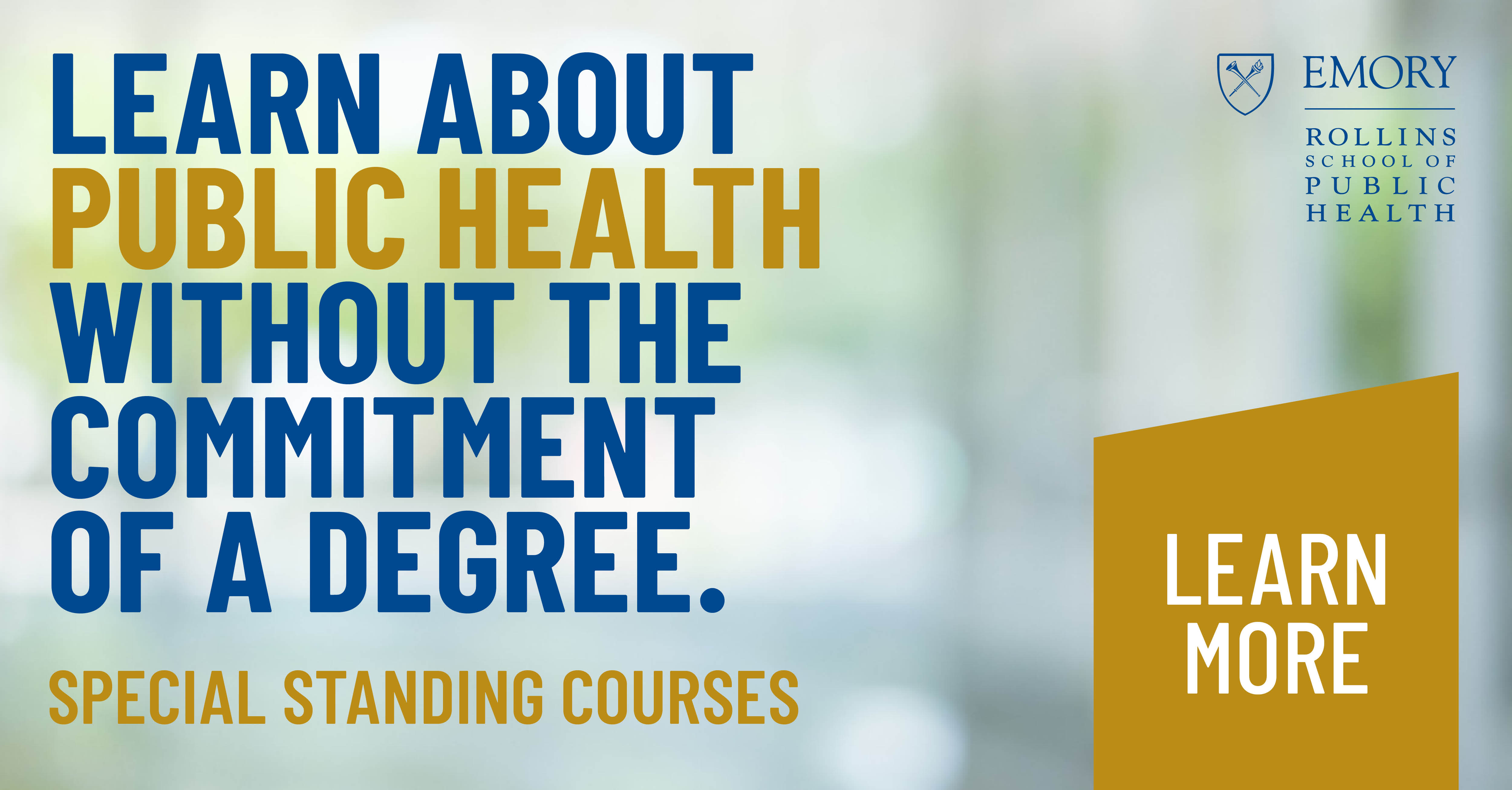 Consider taking an online class at the Rollins School of Public Health, ranked #4 in the nation among schools and programs of public health. Expand your knowledge and engage with our faculty without the commitment of a degree. Take a fall course in an area of interest including Case Studies in Infectious Disease, Preparedness and Planning in Emergency Disasters, Economics, and Qualitative Methods in Global Health. Many online options available. Tuition benefits are available for eligible employees and our process is easy and convenient. Enroll by September 1 for the fall term. To learn more about offerings, pre-requisites, and cost visit our website. |