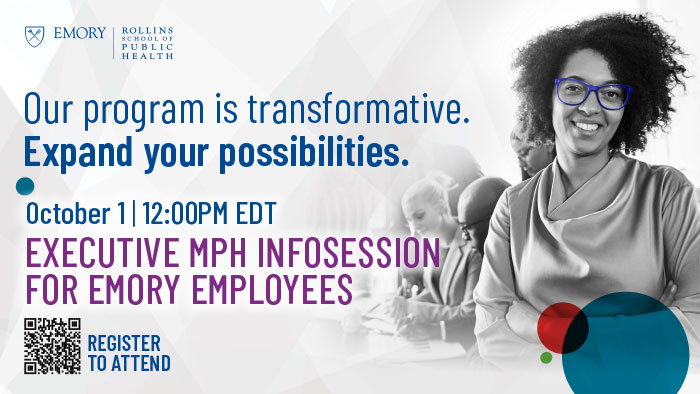 Join us October 1 from 12 p.m. -1 p.m. EDT for our Executive MPH Information Session for Emory employees to learn how to earn your Executive MPH while working full-time at Emory. The Rollins School of Public Health Executive MPH program is designed to work with your lifestyle without sacrificing the community and camaraderie of a residential program. Our convenient hybrid format combines interactive online coursework with two on-campus sessions each semester. Join our community of experienced professionals. Tuition benefits are available for eligible Emory employees. Register here: https://zoom.us/webinar/register/WN_Pip6jDFBRxKANzASrRRu8w |